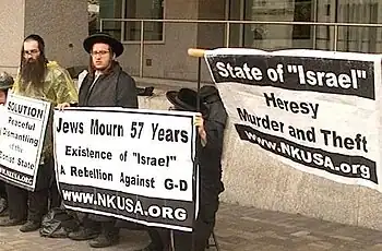 Le courant antisioniste actuel parmi les Juifs haredim se manifeste notamment par le groupe minoritaire et condamné, d'une partie dite des « Sicaires » dans cette communauté ultra-orthodoxe, les Neturei Karta, pour leur soutien aux thèses négationnistes[44]. Selon leur interprétation, le Talmud (Meseches Kesuvos 111a) interdit la création d'un État pour les « fils d'Israël » tant que le messie n'est pas arrivé. Pour les mêmes raisons, ils s'opposent au sécularisme du mouvement sioniste. Ils estiment également que « l'État d'Israël est une cause d'injustices envers les Palestiniens, ce qui est contraire à l'enseignement de la Torah ». Ils reprochent également au sionisme « d'instrumentaliser l'holocauste pour justifier ses actions[45] et l'antisémitisme en général »[46].