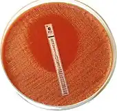 - Parfois, on peut refaire un antibiogramme pour certains antibiotiques choisis par le biologiste. Soit on réalise la procédure décrite en 1. Soit on utilise d'autres techniques plus onéreuses, mais plus simples comme le E-test. On ensemence une boîte de Petri, puis on dépose une bande E-test qui comprend un gradient d'antibiotique croissant d'une extrémité à l'autre (pas d'antibiotique à gauche, concentration maximale à droite) et ces concentrations d'antibiotiques sont écrites directement sur cette bande. On met en incubation la boîte et on lit la CMI à l'intersection du disque d'inhibition avec la bande.