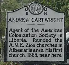 Plaque commémorative pour Andrew Cartwright de l'American Colonization Society, fondateur des églises de Zion au Liberia