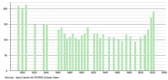 L'évolution du nombre d'habitants est connue à travers les recensements de la population effectués dans la commune depuis 1793. Pour les communes de moins de 10 000 habitants, une enquête de recensement portant sur toute la population est réalisée tous les cinq ans, les populations légales des années intermédiaires étant quant à elles estimées par interpolation ou extrapolation[16]. Pour la commune, le premier recensement exhaustif entrant dans le cadre du nouveau dispositif a été réalisé en 2007[17].