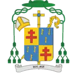 Ecartelé : aux 1 et 4 d'or à la croix patriarcale de gueules; aux 2 et 3 d'azur à trois havets d'or. L'écu surmonté d'une mitre à l'angle dextre et posé sur une croix processionnelle et une crosse posée en barre. Le tout surmonté d'un chapeau de sinople d'où pendent de chaque côté six glands (1, 2 et 3). Devise: Hoc age (Fais ton devoir) de sable sur listel d'argent.