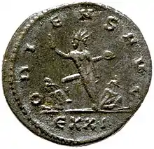 - l'aurelianus marqué XX I en Occident et, K A en chiffres grecs, ce qui s'interprète comme signalant une monnaie contenant 20 parts de cuivre pour 1 part d'argent ;