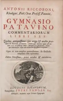 - De Gymnasio Patavino commentariorum libri sex, etc., Padoue, 1598, in-4°. C’est l’histoire de l’Université de Padoue. L’auteur y a inséré quelques-uns de ses discours qui n’avaient point encore été imprimés, ainsi que plusieurs lettres de Sigonius et d’autres savants, avec ses réponses sur la dispute occasionnée par le livre De la consolation. L’ouvrage de Riccoboni est curieux ; mais ceux que Tomasini, Papadopoli, Facciolati ont publié postérieurement sur l’Université de Padoue, sont plus méthodiques et naturellement plus complets.