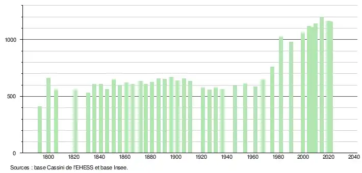 L'évolution du nombre d'habitants est connue à travers les recensements de la population effectués dans la commune depuis 1793. Pour les communes de moins de 10 000 habitants, une enquête de recensement portant sur toute la population est réalisée tous les cinq ans, les populations légales des années intermédiaires étant quant à elles estimées par interpolation ou extrapolation[40]. Pour la commune, le premier recensement exhaustif entrant dans le cadre du nouveau dispositif a été réalisé en 2004[41].