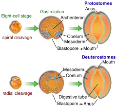 En fait, l'apparition de l'anus semble s'être produite au moins deux fois au cours de l'évolution, et en suivant des chemins évolutifs différents ; chez les protostomiens et les deutérostomiens[6].
