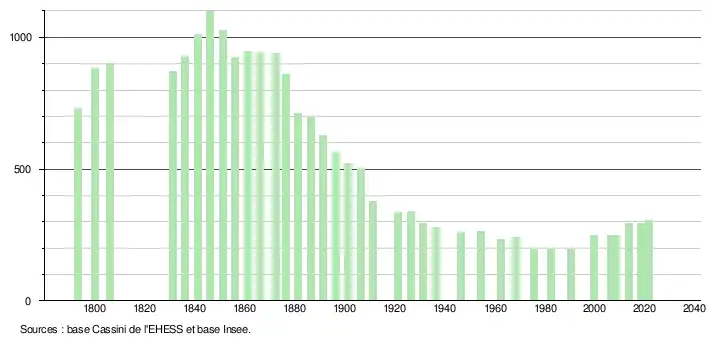 L'évolution du nombre d'habitants est connue à travers les recensements de la population effectués dans la commune depuis 1793. Pour les communes de moins de 10 000 habitants, une enquête de recensement portant sur toute la population est réalisée tous les cinq ans, les populations légales des années intermédiaires étant quant à elles estimées par interpolation ou extrapolation[21]. Pour la commune, le premier recensement exhaustif entrant dans le cadre du nouveau dispositif a été réalisé en 2008[22].