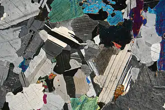 - Texture perthitique et texture antiperthitique : exsolution d'albite dans du feldspath potassique ou exsolution de feldspath potassique dans le plagioclase.