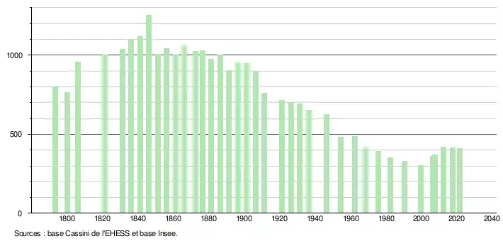 L'évolution du nombre d'habitants est connue à travers les recensements de la population effectués dans la commune depuis 1793. Pour les communes de moins de 10 000 habitants, une enquête de recensement portant sur toute la population est réalisée tous les cinq ans, les populations légales des années intermédiaires étant quant à elles estimées par interpolation ou extrapolation[23]. Pour la commune, le premier recensement exhaustif entrant dans le cadre du nouveau dispositif a été réalisé en 2007[24].