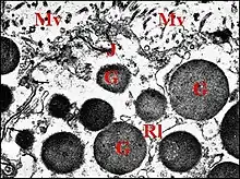 Les grains de sécrétion paraissent y naître près du pôle basal dans le réticulum endoplasmique (Fig.16). Ils sont régulièrement sphériques, homogènes, d’opacité variable, avec un contour très net comme tracé au compas mais parfois un peu " décollé " de la membrane qui les limite. Ils gagnent le pôle apical de l'adénocyte (Fig.10 à 12) ; leur contenu y est extrudé dans la lumière (Fig.15), parfois entre les pieds des microvilli et se joint au matériel sécrétoire qui l’emplit.Les autres organites sub-cellulaires sont de petites mitochondries sphériques (Fig.13,16), à crêtes estompées, à matrix très claire, siégeant surtout près du noyau dans le pôle basal et de petites vésicules apicales. Ces dernières paraissent vides mais ont une membrane très contrastée (vésicules recouvertes) et sont parfois libérées dans la lumière avec le contenu des grains (Fig.15). Bien qu’il n’ait pas été observé de dictyosomes individualisés, elles pourraient avoir une origine golgienne. La cohésion des adénocytes est assurée par de petites jonctions sub-apicales (desmosomes zonaires) (Fig.12).