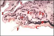 Le corps est formé par un épithélium simple (Fig.4 à 9) reposant sur une basale et non surmonté d’un revêtement cuticulaire. Ses cellules glandulaires ou adénocytes, prismatiques ou pyramidales, renferment des "boules" ou sphérules logées dans des "vacuoles" plus ou moins apparentes, déformant souvent le noyau et captant en général les colorants acides tels que le bleu d’aniline et l'éosine. Teintés également en violacé par l’hématoxyline de Mallory (Fig.7), ces grains de sécrétion réduisent le réactif de Schiff dans la méthode à l’APS (Fig.6,8). Ils passent ensuite dans la lumière et s’y accumulent sous forme d’une masse de sécrétion plus ou moins homogène et à contours festonnés (Fig. 5 à 9).