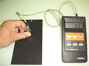 - induction magnétique, pour la mesure de l'épaisseur de revêtement de toutes les couches non magnétiques sur substrat ferromagnétique. Par exemple : isolants électriques (peinture, laque, vernis, matière plastique, émail) ou métaux non magnétiques (zinc, chrome, cuivre, laiton, bronze, certains aciers inoxydables, aluminium, titane) sur le fer ou l'acier. La mesure d'épaisseur dépend de la perméabilité magnétique du support ;