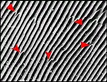 Au M.E.B., il s’agit d’une zone oblongue, entièrement glabre mais cernée par de nombreux poils, et déprimée en gouttière peu profonde (Fig.1 à 3, Fig.5). Elle porte sur toute sa surface une série de 30 à 40 crêtes parallèles, équidistantes, bifurquées parfois à leurs extrémités et séparées par des sillons uniformes qui ont tous la même longueur (Fig.3).