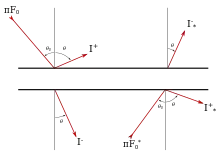 Le flux est séparé en deux composantes, l'une descendante ou transmise et l'autre montante ou réfléchie[8]. En notant μ l'angle d'incidence des rayons parallèles sur la couche considérée, μ0 l'angle zénithal et πF0 la valeur du flux par unité de surface perpendiculairement au rayon incidence, les deux flux sont définis de la façon suivante[9]: