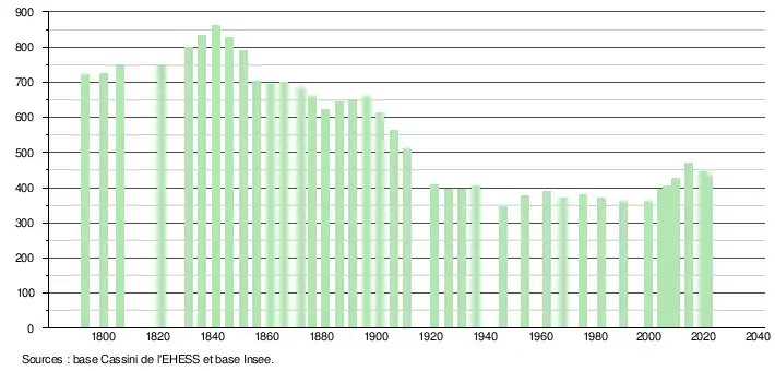 L'évolution du nombre d'habitants est connue à travers les recensements de la population effectués dans la commune depuis 1793. Pour les communes de moins de 10 000 habitants, une enquête de recensement portant sur toute la population est réalisée tous les cinq ans, les populations légales des années intermédiaires étant quant à elles estimées par interpolation ou extrapolation[20]. Pour la commune, le premier recensement exhaustif entrant dans le cadre du nouveau dispositif a été réalisé en 2004[21].