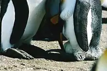 Après l'éclosion, les poussins sont encore portés sur les pieds de leurs parents pendant 30 à 40 jours. Le temps que le plumage et le système d'autorégulation de la température corporelle se mettent en place.