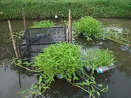 "Épinard d'eau" cultivé autour d'une cage à poisson (IMTA)