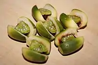 - le supari blanc, la variété blanche de la graine est obtenue par décorticage des noix mûre puis séchage au soleil pendant au moins 12 jours