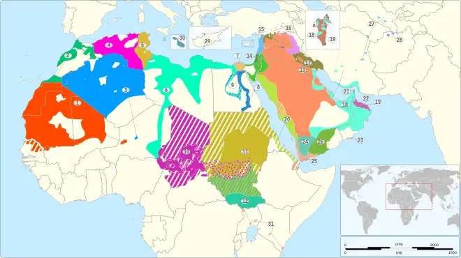 Les langues vernaculaires orales, différentes l’une de l'autre dans chaque région, et influencées par l’arabe standard sont appelées arabe dialectal[11], les substrats, superstrats et emprunts diffèrent selon les régions.