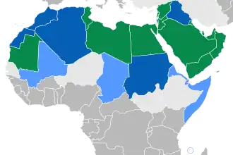 L'arabe est parlé à des degrés divers dans les pays arabes du Moyen-Orient, en Iran (province du Khouzistan), en Turquie (frontière turco-syrienne), en Israël[9], dans les pays d'Afrique du Nord, du Sahara, du Sahel et sur les côtes de la Corne de l'Afrique.