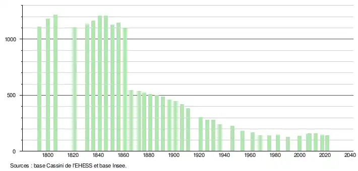 L'évolution du nombre d'habitants est connue à travers les recensements de la population effectués dans la commune depuis 1793. Pour les communes de moins de 10 000 habitants, une enquête de recensement portant sur toute la population est réalisée tous les cinq ans, les populations légales des années intermédiaires étant quant à elles estimées par interpolation ou extrapolation[20]. Pour la commune, le premier recensement exhaustif entrant dans le cadre du nouveau dispositif a été réalisé en 2007[21].