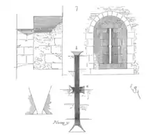 Archère-canonnière[25] à double croisillon et étrier au sommet de la fente.