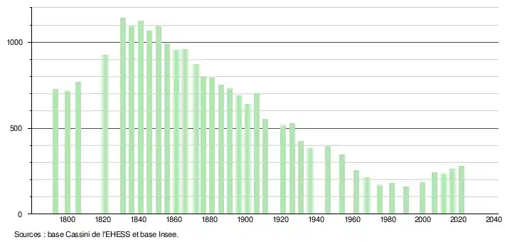 | L'évolution du nombre d'habitants est connue à travers les recensements de la population effectués dans la commune depuis 1793. Pour les communes de moins de 10 000 habitants, une enquête de recensement portant sur toute la population est réalisée tous les cinq ans, les populations légales des années intermédiaires étant quant à elles estimées par interpolation ou extrapolation[38]. Pour la commune, le premier recensement exhaustif entrant dans le cadre du nouveau dispositif a été réalisé en 2006[39]. En 2021, la commune comptait 279 habitants[Note 5], en augmentation de 11,16 % par rapport à 2015 (Haute-Garonne : +7,43 %, France hors Mayotte : +1,84 %). |