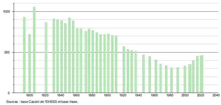 L'évolution du nombre d'habitants est connue à travers les recensements de la population effectués dans la commune depuis 1793. Pour les communes de moins de 10 000 habitants, une enquête de recensement portant sur toute la population est réalisée tous les cinq ans, les populations légales des années intermédiaires étant quant à elles estimées par interpolation ou extrapolation[19]. Pour la commune, le premier recensement exhaustif entrant dans le cadre du nouveau dispositif a été réalisé en 2005[20].