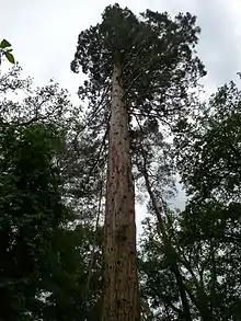 Après le massif de faux-cyprès (Xanthocyparis nootkatensis et Chamaecyparis lawsoniana), un magnifique pin de Corse, de rectitude parfaite et dépassant les 35 m, domine la végétation.