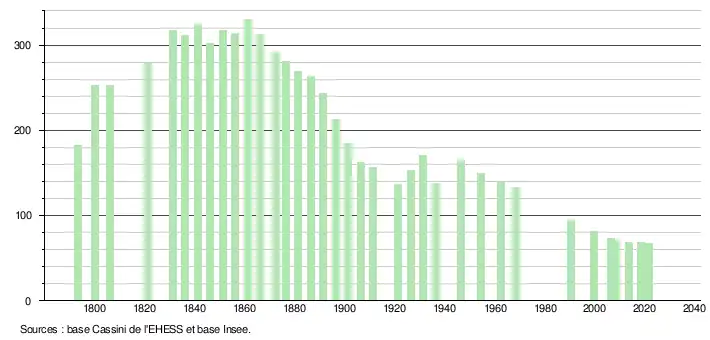 L'évolution du nombre d'habitants est connue à travers les recensements de la population effectués dans la commune depuis 1793. Pour les communes de moins de 10 000 habitants, une enquête de recensement portant sur toute la population est réalisée tous les cinq ans, les populations légales des années intermédiaires étant quant à elles estimées par interpolation ou extrapolation[15]. Pour la commune, le premier recensement exhaustif entrant dans le cadre du nouveau dispositif a été réalisé en 2008[16].