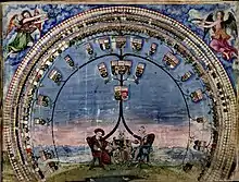 Dans le christianisme, la représentation graphique des relations familiales au Moyen Âge se fait sur le modèle biblique de l'Arbre de Jessé représentant Jessé assis ou allongé "portant" un arbre lui sortant du dos avec ses descendants dont le roi David et Jésus de Nazareth. D'autres dessins montrent Jessé avec cet arbre sortant du ventre. Jessé étant l'ascendant, Jésus son descendant se situe tout en haut de l'arbre. L'arbre de Jessé est apparu dès le XIIe siècle et traduit en image la généalogie de Jésus telle que donnée par les Évangiles de Matthieu et Luc[3]. Pour autant ce modèle n'est pas la seule origine de l'arbre généalogique car il est apparu peu de temps avant l'essor des arbres généalogiques non bibliques ; le Compendium historiae in genealogia Christi (Abrégé de l'histoire à travers la généalogie du Christ) de Pierre de Poitiers réalisé sur un rouleau de parchemin à la fin du XIIe siècle a l'avantage de ne pas avoir à tourner de pages pour dérouler une généalogie et aura une influence sur les chroniques généalogiques réalisées ultérieurement[2].
