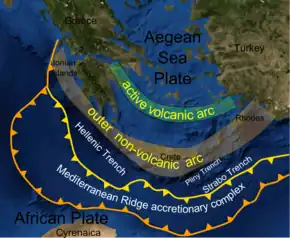 L'arc égéen ou arc hellénique est une structure tectonique située dans le Sud de la mer Égée, en Grèce. Il est en réalité composé de plusieurs arcs, dont des fosses océaniques, un arc non volcanique et l'arc volcanique sud-égéen (en), archipel volcanique composé de huit volcans disposés en arc de cercle avec d'ouest en est Égine, Méthana, Milos, Santorin, le plus actif, Kolumbo, Nissiros, Kos et Gyalí.