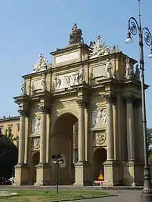 L'arc possède trois ouvertures, une plus grande centrale avec deux petites latérales et est décorée de dix colonnes dotées de chapiteaux corinthiens. La plupart des sculptures et des reliefs ont été créés localement. Ses bas-reliefs célèbrent le rôle impérial en Italie et sont accompagnés de représentations de drapeaux et d'armes. La façade sud possède deux aigles à double tête, le symbole de la dynastie des Habsbourg. Au sommet de l'arc se trouve une statue équestre qui serait François Ier lui-même, semblant marcher hors de la ville. Au sommet sont perchées près d'une demi-douzaine de statues mythologiques allégoriques.