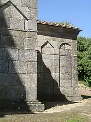L'arc en mitre orne les murs de la chapelle de São Frutuoso de Montélios près de Braga au Portugal. Cette chapelle wisigothique présente le même plan en croix que le mausolée de Galla Placidia à Ravenne[2] à la différence que les murs extérieurs de ses absides sont ornés de triplets constitués d'un arc en mitre encadré de deux arcs en plein cintre.