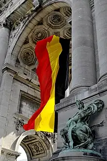 La décoration du monument et les sculptures qui l'ornent ont été confiées aux artistes les plus en vue de l'époque dans un esprit d'exaltation nationale. Le quadrige de bronze qui le surmonte et qui représente « le Brabant élevant le drapeau national », ainsi que les sculptures qui l'entourent sont l'œuvre de Thomas Vinçotte et Jules Lagae ; les huit autres provinces sont représentées assises aux pieds des piliers. La colonnade, à l'origine ouverte, fut fermée à l'arrière par un mur en 1905, qui fut ensuite décoré d'une frise en mosaïque de 360 mètres carrés dont le thème est « la glorification de la Belgique pacifique et héroïque ».