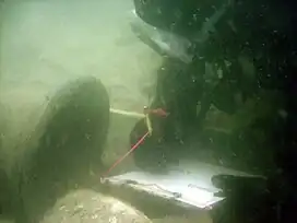 Un archéologue maritime documentant une grande cloche de navire en bronze de la fin du XVIIIe siècle.