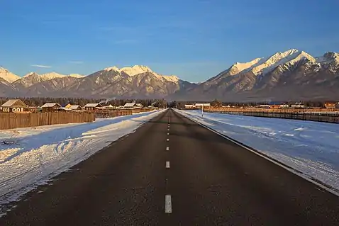 Le village en contrebas dans la dépression de Tounka avec les monts Khamar-Daban enneigés en arrière-plan | |