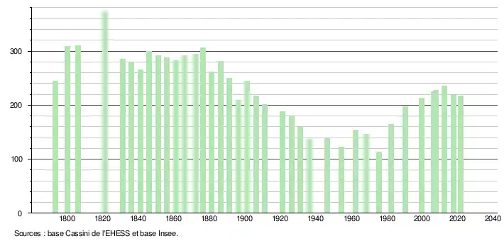L'évolution du nombre d'habitants est connue à travers les recensements de la population effectués dans la commune depuis 1793. Pour les communes de moins de 10 000 habitants, une enquête de recensement portant sur toute la population est réalisée tous les cinq ans, les populations légales des années intermédiaires étant quant à elles estimées par interpolation ou extrapolation[14]. Pour la commune, le premier recensement exhaustif entrant dans le cadre du nouveau dispositif a été réalisé en 2007[15].