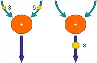 Un nœud computationnel peut être représenté comme le sommet d'un graphe. Les jetons circulent sur les arcs reliant les sommets. Quand deux jetons contenant respectivement les valeurs 3 et 5 se présentent aux entrées du nœud, celui-ci exécute l'opération pour laquelle il est conçu (ici une addition), génère un jeton en sortie représentant la somme (3 + 5), 8, et supprime les jetons d'entrée :