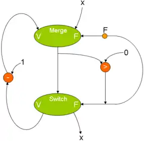 Grâce à deux types de nœuds appelés switch et merge, on peut coder la condition si. Le premier type possède deux entrées et deux sorties, tandis que le second possède trois entrées et une sortie. Le type switch répercutera son jeton d'entrée sur l'une ou l'autre de ses sorties suivant l'état de sa seconde entrée. Le type merge fera la sélection d'un de ses deux jetons d'entrée suivant la valeur d'un troisième. Schématiquement :