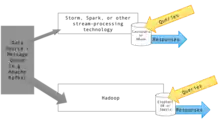 Les technologies de traitement de flux généralement utilisées dans cette couche incluent Apache Storm, SQLstream, Apache Spark ou Apache Flink. La sortie est généralement stockée sur des bases de données NoSQL rapides[5],[6].