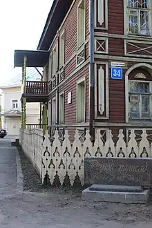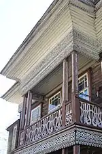 Pour la décoration, on utilise autour des chambranles des fenêtres des sculptures complexes de style modern. Ce style apparaît également sur les balcons prenant la forme de fleurs, de fruits et de silhouettes d'animaux[13]. Les angles des façades sont également décorés de motifs plats découpés dans le bois, entourés d'un cadre: