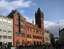 L'hôtel de ville de Bâle (1504 – 1514) comporte trois parties bâties successivement, la partie centrale originelle comporte trois arcades menant à la cour intérieure dont une des façades est ornée d'une horloge. Ses façades de couleur rouge sont caractéristiques. La salle du Conseil d'État est décorée de boiseries et vitraux. Hans Holbein avait réalisé une peinture murale (aujourd'hui disparue)[mh 1].
