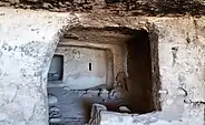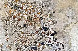 La pièce intérieure présente un décor peint d'un style complètement différent de celui de la pièce extérieure, plus grande. Au lieu d'un embellissement architectural, les murs et le plafond voûté de cette pièce présentent un programme complexe de vignes entrelacées, de fleurs, de personnages, de plusieurs variétés d'oiseaux locaux et d'insectes. Plusieurs érotes — petits dieux ailés associés à l'amour et parfois à la culture du vin — sont vus participant à la gestion de la viticulture, utilisant des échelles et des crochets de taille, portant des paniers de raisins récoltés et défendant les vignes contre les oiseaux charognards. Les érotes sont armés d'arcs, de flèches et de lances. Outre les vignes domestiquées et récoltées, des framboisiers sauvages et des fleurs de liseron s'enroulent dans la scène pour rendre hommage à la flore locale de l'arrière-pays nord de Petra. Les Twaissi et Abudanh ont pu identifier une figure anthropomorphe supplémentaire dans la scène en plus des érotes, qu'ils interprètent comme une représentation de la déesse égyptienne romanisée. Cependant, la scène iconographique globale et les parallèles architecturaux ailleurs dans la région de Petra donnent du poids à l'attribution de l'espace comme un centre de culte dionysiaque[36],[37],[38].