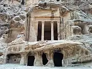 À Pétra, il y a une série de tombes appelées les « tombes royales ». Ces tombes sont divisées en quatre sections : la tombe de l'urne, la tombe de la soie, la tombe corinthienne et la tombe du palais. La tombe de l'Urne est construite en hauteur sur le flanc de la montagne et nécessite l'ascension d'un certain nombre d'escaliers. Il a été suggéré qu'il s'agit de la tombe du roi nabatéen Malchus II, mort en 70 apr. J.-C. À côté se trouve la Tombe de la Soie, ainsi nommée en raison de la riche couleur du grès. La tombe corinthienne est la suivante, avec des colonnes corinthiennes grecques. Enfin, la tombe du palais, dont la façade comporte trois étages distincts[33].