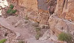 La pente du canal était calculée pour un débit optimal et suivant son parcours, le canal était à l'air libre ou couvert avec des pierres plates. Dans le cas de pentes trop importantes, et afin d'éviter le débordement et la perte de l'eau, des puits étaient réalisés le long du parcours afin de « casser » la vitesse de l'eau, mais également permettre une décantation des particules de sable et de pierre qui pouvaient être entraînées par le courant[72],[85]. Suivant les archéologues, les canaux couverts de pierres étaient utilisés pour le transport des eaux à usage domestique, alors que les canaux laissés à l'air libre servaient au transport de l'eau destinée au bétail ou aux jardins et à l'agriculture[86],[87]. À l'époque de l'occupation romaine, le creusement de canaux à flanc de montagne fut renforcé par la pose de tuyauteries en terre cuite, placées parfois elles-mêmes dans les anciens canaux — côté est du Sîq. Ces nouveaux réseaux sont constitués de tuyauteries en terre cuite avec emboîture et joint au mortier, avec des épaisseurs pouvant varier de 1 à 6 cm et des diamètres de 15 à 25 cm. « L'archéologue Pilipp C. Hammond a trouvé des canalisations faites d'emboîtements de poterie dans le théâtre[88],[89]. » Certains réseaux de tuyauteries étaient en céramique avec une épaisseur de 5 mm ou parfois moins et d'une longueur de 30 cm[90],[89]. La particularité de ces réseaux de tuyauteries était double : chaque élément de tuyau, principalement ceux en terre cuite, d'une longueur de 30 à 100 cm, avait une forme rétrécie en son milieu, comme pour créer un « venturi » lors du passage de l'eau, forme spécifique rappelant la forme des tuyauteries en terre cuite du palais de Knossos en Crète[53]. Une autre particularité de certaines tuyauteries en terre cuite posées à Pétra se trouve dans les ondulations sinusoïdales dans la partie intérieure du tuyau, réalisées au moment de la fabrication et qui, suivant les experts, permettait une augmentation dans le débit de la tuyauterie, ceci à partir d'observation empirique[85].