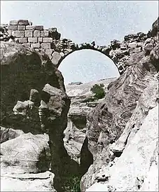 Strabon parle aussi des eaux provenant de sources abondantes : « et la partie intérieure de la ville ayant des sources en abondance, tant pour les besoins domestiques que pour l'arrosage des jardins[47] ». Pour capter l'eau douce des quelques sources disponibles et pour retenir les eaux torrentielles qui se déversent des montagnes dans la vallée de novembre à avril, les habitants y ont érigé au fil des siècles des structures de captage, de stockage et de distribution de ces eaux venues du ciel ou du sous-sol. On trouve ainsi plusieurs arches supportant des aqueducs étroits pour passer d'une falaise à l'autre, sans changer de niveau, et des qanats creusés dans les profondeurs de la montagne[48],[49],[50].