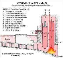 - Vitruve, Chauffage. Le foyer ; les conduites d'eau chaude et de vapeur, planche 54, fig. 1.