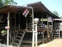 On accède au premier étage par un escalier extérieur, réduit à une simple échelle dans les zones rurales. On se déchausse en général au bas des marches. L'escalier mène à une sorte de véranda couverte dont le sol est en bois. Cette véranda sert de salle à manger. De la véranda, on accède à une grande pièce, parfois la seule de la maison. Cette pièce peut être divisée en petits compartiments qui permettent aux parents de s’isoler. Les enfants dorment souvent ensemble, sur une natte, avec la grand-mère.