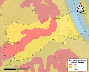 Le retrait-gonflement des sols argileux est susceptible d'engendrer des dommages importants aux bâtiments en cas d’alternance de périodes de sécheresse et de pluie. 94 % de la superficie communale est en aléa moyen ou fort (67,4 % au niveau départemental et 48,5 % au niveau national). Sur les 209 bâtiments dénombrés sur la commune en 2019, 209 sont en aléa moyen ou fort, soit 100 %, à comparer aux 84 % au niveau départemental et 54 % au niveau national. Une cartographie de l'exposition du territoire national au retrait gonflement des sols argileux est disponible sur le site du BRGM[19],[Carte 2].