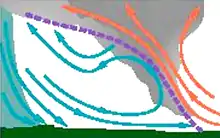 L'aspect en rouleau est dû à la variation de vitesse et de direction des vents avec l'altitude (cisaillement). Les vents près du sol étant ceux de l'environnement alors que ceux de la goutte sont dans une direction opposée[7]. Si la goutte est de faible extension verticale, la rotation induite par la différence des vents, flèches bleues, dans la goutte ramène le sommet de l'arcus vers le bas dans son flanc arrière.